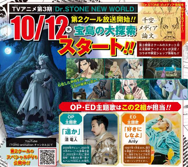 アニメ 第3期『Dr.STONE NEW WORLD』が2023年10月12日(木)より、第2クールが放送される事が決定しました。第2クールOPテーマ&EDテーマ情報も発表されています。また、TOKYO MX、BS11ほかで放送され、前半第1クールと同様、毎週木曜22時30分から放送されます。8月26日現在、発表されている放送局は以下の通りです。