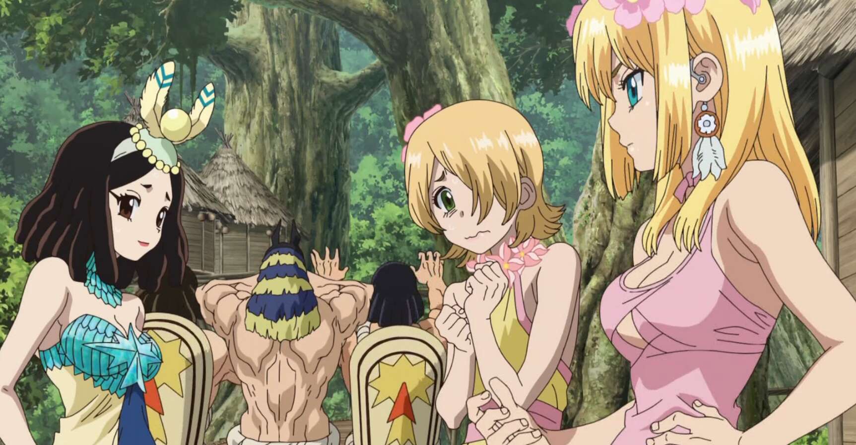 一方、後宮に潜入しているコハクは何かを見つけ、確認しようとします。アマリリスが兵士の隙を作り、頭首が棲む大木の付近をコハクが調べると、コハクが予想した通り何かを見つけます。それは科学王国の勝利を決定づける科学の鍵でした。