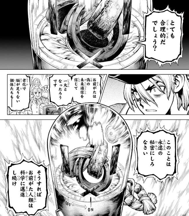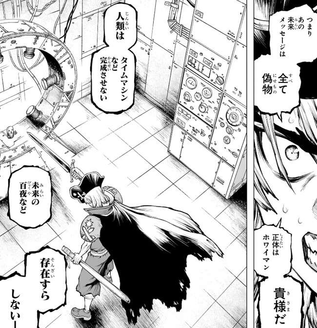 ラボのホワイマンは、とても合理的だったでしょう?と、龍水に言い、多くの科学者がタイムマシン開発に否定的でしたが、偽の未来通信を信じると、一丸となってタイムマシン開発に取り組んだことをホワイマンは指摘します。この事を永遠に秘密にすれば、人類は科学に邁進し続け、永遠に生きるホワイマンはいつの日かタイムマシンに出会える、とホワイマンは言い、龍水もそれが合理的かもしれないとホワイマンの考えを認めます。