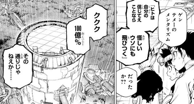 ゲンのメンタリズム、ヒトは自分の信じてえことなら怪しいウソにも飛びつく、という言葉を千空はゲンに確認しますが、蚊の石像を見た時に既に何か分かったようで、千空は手で顔を覆います。
