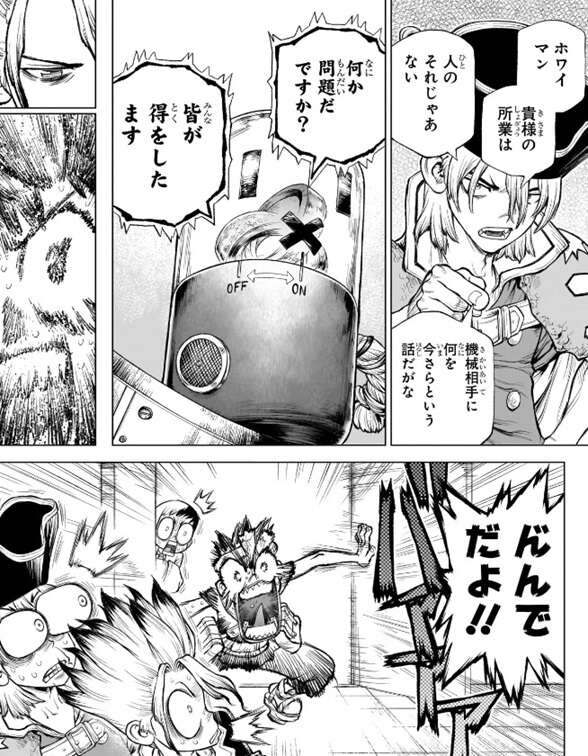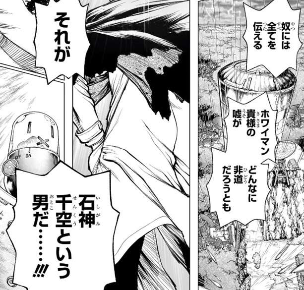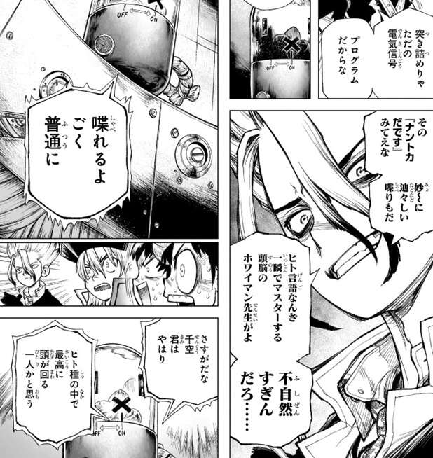 しかし、千空は人の心も突き詰めればただの電気信号、プログラムだと冷めた意見を言いますが、だからこそホワイマンがヒトの心を分からない訳はないと断言します。「ナントカだです」という妙に辿々(たどたど)しい喋りも、ヒト言語を一瞬でマスターできる頭脳を持つホワイマンには不自然すぎる、と千空が指摘すると、ああ喋れるよ、ごく普通に、とホワイマンは突然、喋り方を変えます。そして、千空がヒト種の中で最高に頭が回る一人かと思う、と気付いた千空を褒めます。