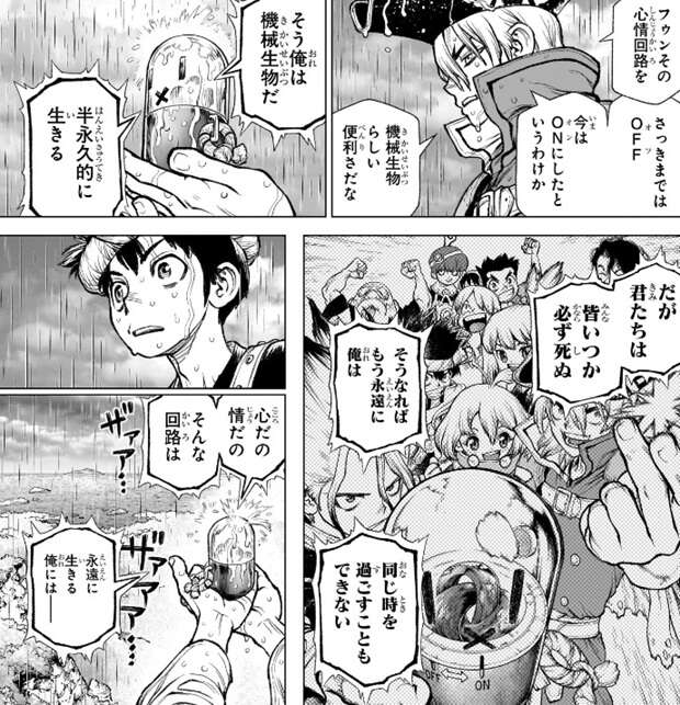 千空はホワイマンと一緒にいる時間がアホほど長いだけだ、と謙遜しますが、ホワイマンは、そう、長すぎるんだ、共に過ごした時間が、だから俺は辿々(たどたど)しい喋りをする、と自分が辿々(たどたど)しい喋りをする理由を教えます。ホワイマンが話した理由をゲンが理解できずにいると、ホワイマンは高台に連れて行って欲しいと言います。宇宙エレベーター試験場へとホワイマンを連れて行きますが、ホワイマンは人の心や情は群れを効率よく維持するための、ただの高度なプログラム、心情回路だと言います。そして、ホワイマンはその心情回路をさっきまではOFF、今はONにしているようです。ホワイマンは機械生物で半永久的に生きますが、人類はいつか必ず死ぬ、そうなればホワイマンは永遠に同じ時を過ごすことは出来ない、とホワイマンは言います。