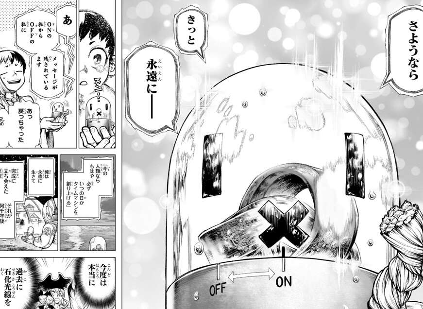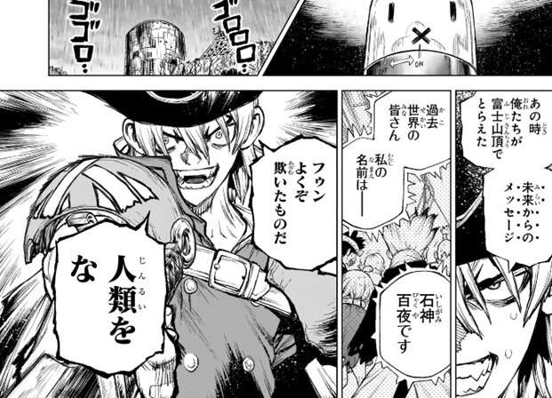 その石化波が未来の百夜から送られてきたモールス信号となるように、何度も何度も放出していました。あの未来メッセージは全てホワイマンが出した偽物で、人類はタイムマインなど完成させておらず、未来の百夜も存在しない、というのが龍水が出した結論でした。