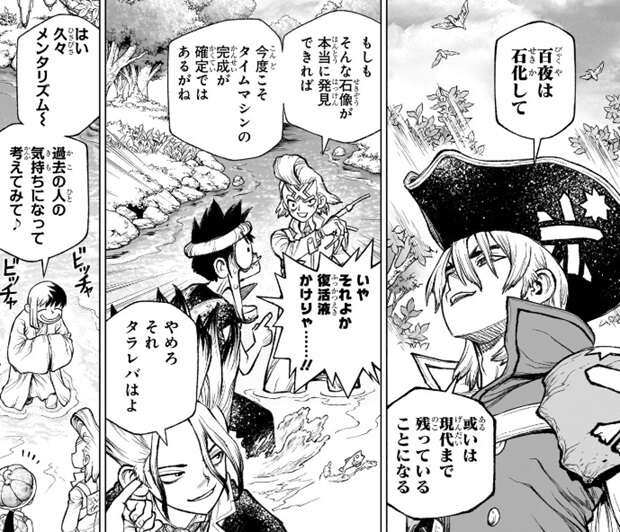石神百夜の上に石化光線が送られるなら、百夜は突然石化してしまいます。もし、百夜が石化していたら石像は現代まで残り、その石像を発見できれば、タイムマシンの完成は確定と言っていいでしょう。それどころか復活液をかければ、現代に百夜が復活しそうです。千空達は宝島に行き、チェルシーたちと合流した後、ゲンのメンタリズムで石像がどこにあるかを推測します。