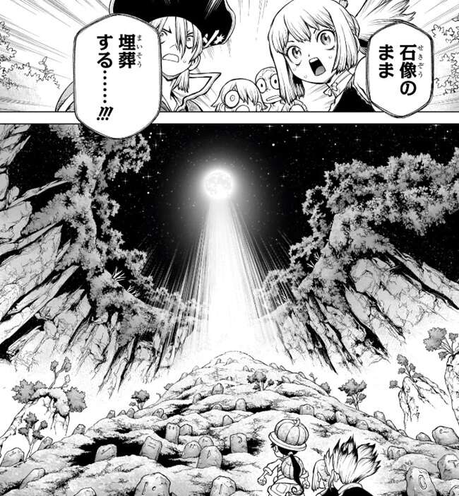 まず突然石化した百夜を、周りの人は病気になったと思い、色々試した後、放置するだろうとゲンは推測します。そして時間が経つと、周りの人はいずれ石像になった百夜を死んだものと見なし、石像のまま埋葬するだろうとゲンは推測、6巻でルリに教えられた石神村の墓地へと行きます。そして、千空達は創始者の墓石があった場所を掘って、百夜の石像がないか確かめようとします。
