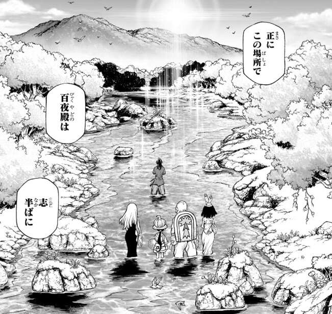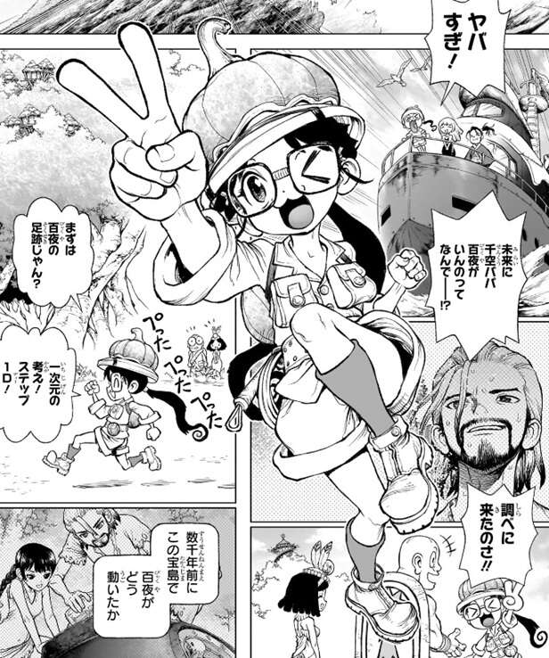 前回、龍水がホワイマンを責めている場面で終わっていましたが、今回はチェルシーが宝島で百夜の足跡をたどっている場面から始まります。なぜ、未来に百夜がいるのかという事を調べるために、数千年前に百夜がどう動いたかをルリ、ソユーズ、松風達に協力してもらいながら調べます。百夜が希少鉱物を集めていた場所を、チェルシーが地理学者の視点から調べていきます。
