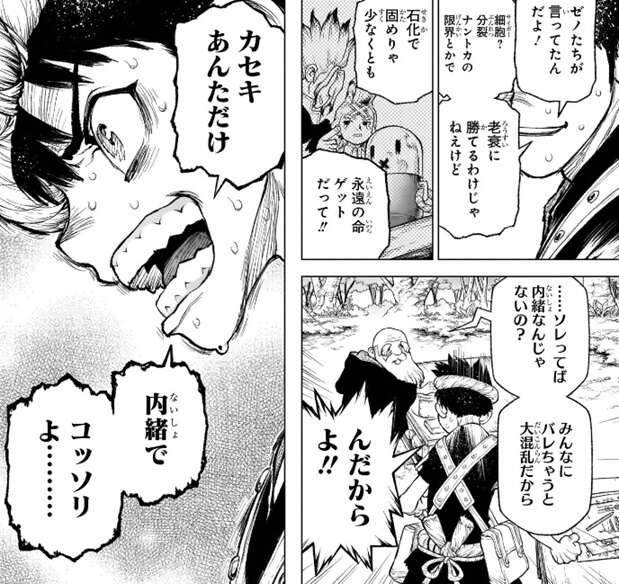 クロムは前回、タイムマシンが完成する数十年後までは絶対最後まで見れない、というカセキの言葉を聞いていました。その言葉を思い出し作業中に、ホワイマンの石化光線で石化しないか……?と、突然カセキに提案します。細胞の老衰に永久に対抗できるかは未だに謎ですが、少なくとも石化していれば永遠の命を手に入れられる、とクロムはカセキに言います。石化光線で死を克服できる事は皆には内緒になっていますが、クロムは、カセキだけ内緒でコッソリやろう、と持ち掛けます。しかしカセキは、でも大丈夫よワシ、そんなのいらないから、とクロムの提案を断ります。
