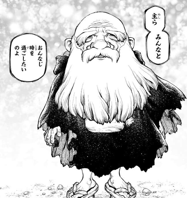 クロムはタイムマシン完成までカセキには生きていて欲しいのですが、大事な残りの時間は、主らみんなとおんなじ時を過ごしたいのよ、とカセキは笑顔でクロムに話しかけます。