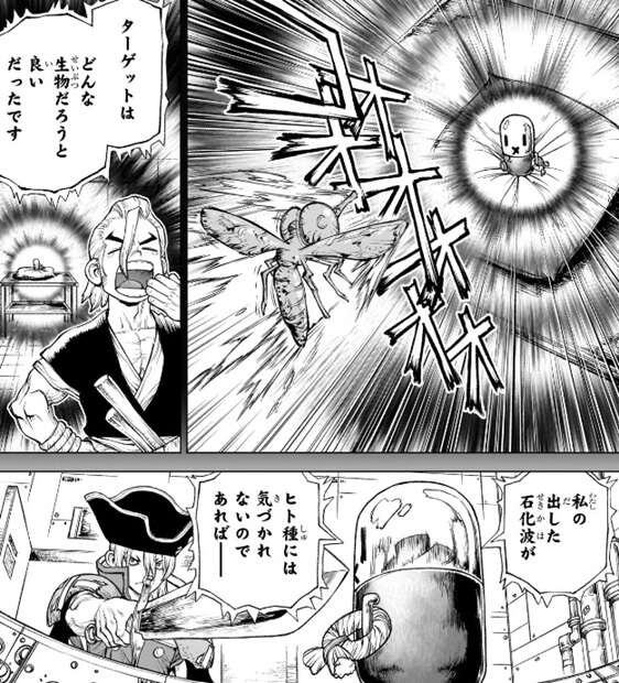 ホワイマンは、あの日関東地方のアカイエカを石化したのは、ただあの時側にいたからだと龍水に説明します。ターゲットはどんな生物でも良く、石化波がヒト種に気付かれないのであれば良かった、とホワイマンは言います。