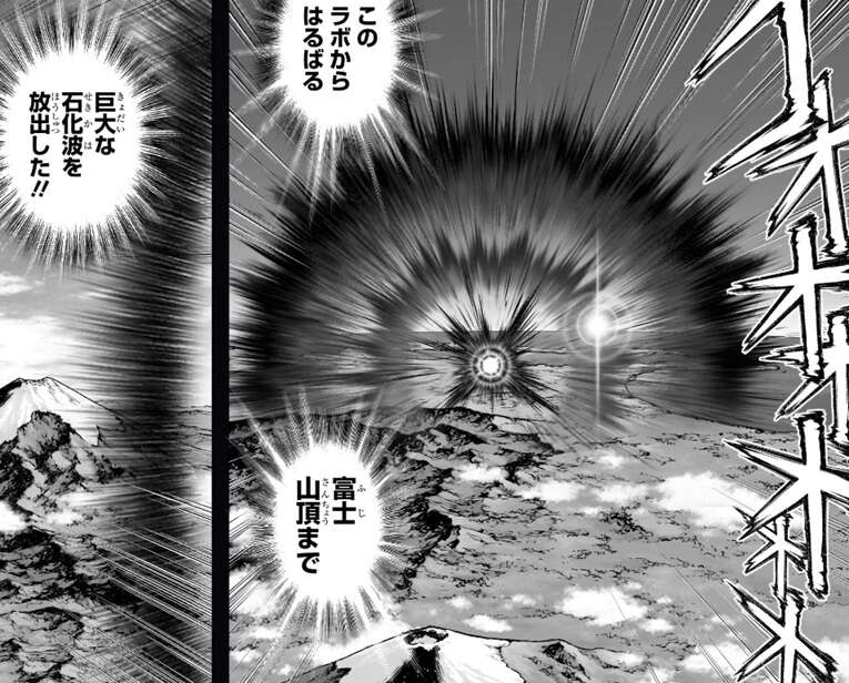 龍水のホワイマンへの疑惑が確信に変わったのは、ホワイマンの電池が切れた時だったそうです。ホワイマンは、ラボから富士山頂まで巨大な石化波を何度も何度も放出していました。