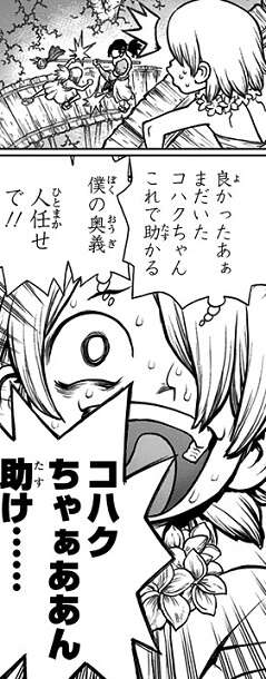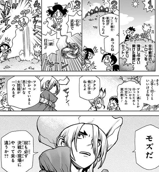 カセキがドローンの部品を作っている間、杠、クロム、羽京を石化から復活していると、アマリリスが千空達の隠れ家に逃げてきます。アマリリスはコハクと銀狼がわざと石化した事、頭首が既に石化している事を千空達に涙ながらに伝えます。千空達はその情報から、石化王国の全貌を推測し始めます。