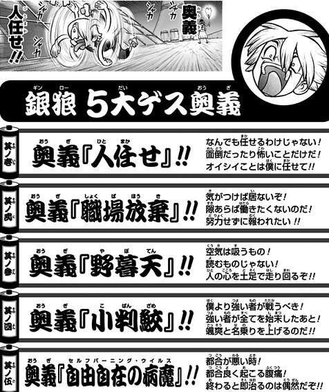 銀狼は5大ゲス奥義を使えるそうです。『人任せ』、『職場放棄』『野暮天』『小判鮫』『自由自在の病魔』と、どれもこれも最低ですね。