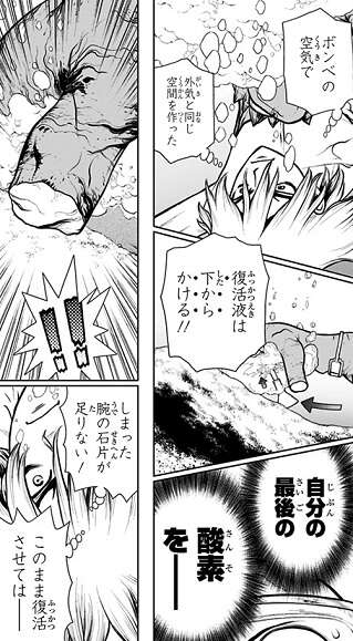 バラバラになった龍水を、復活液を使って無事復活させた千空達は、次はドローン作成の為にカセキを復活させようとします。しかし、カセキの石像は海に投棄されていて、さらに海上は侵入者を警戒して船で警備されていて、潜水して化石の石像を回収するしかありません。しかし、海底を捜索しようにも息が続かず、千空は水中ボンベを作ろうとします。
