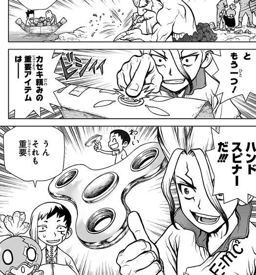 化石の石像を海底から回収し、さらに大樹が200~300往復、海底に潜ってくれたおかげで、他の石片、石像もほぼ全て回収できました。カセキを石化から復活させて、ようやくドローン制作に取り掛かった千空は、まずはプロペラ、ハンドスピナーを作ろうとカセキに工作を色々お願いします。
