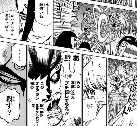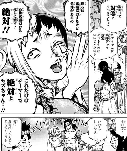 アマリリスを追跡したモズ相手に、ゲンはメンタリストのテクニックを使ってモズから情報を聞き出します。モズから頭首はイバラによって既に石化されている事、モズはイバラを殺したいが、石化武器を預かっているキリサメが邪魔で今のところ手が出せない事を聞き出し、さらにゲンはモズに対等な取引を持ち掛けモズに協力する条件として、石化武器を渡すように交渉します。
