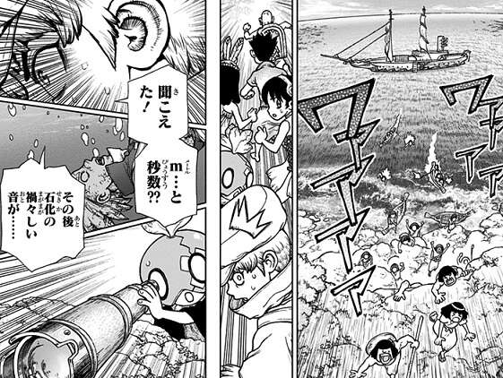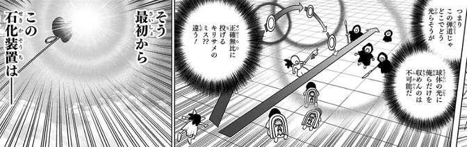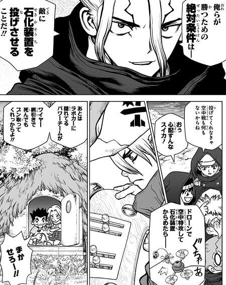 霧雨が石化装置を投げて、龍水がドローンでからめとろうとした瞬間、龍水は何か致命的な見落としをしている感覚に襲われ、ドローンを操作するのを止めます。千空はその感覚、違和感を科学的に分析し、キリサメが投げている石化装置がフェイクである事を突き止め、即刻全員にラボカーへ飛び込むように号令をかけます。一方、モズもキリサメの投げようとしている石化装置がフェイクだと分かり、モズも作戦を変更し千空達を皆殺しにしようと動きます。