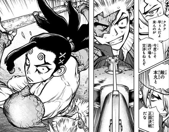 モズと一時協定を結び共闘の形となりますが、狡猾で慎重なイバラに裏切りを感づかれそうになると、すぐに千空達を裏切り結局三つ巴の形は崩れてしまいます。その後モズも氷月に敗れる結果になってしまいますが、天才のモズに化学王国製の管槍と500年の歴史を受け継ぐ尾張貫流槍術で氷月が圧倒する戦闘シーンはいいですね。このマンガの科学のテーマとも合致していて、なかなか痺れる戦闘シーンでした。
