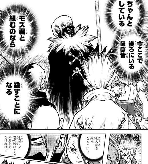 千空側についた氷月に、モズは本気を出して氷月に戦闘を挑みます。本気を出したモズは氷月すら圧倒し、あっという間に氷月はモズに追い込まれてしまいます。一方、キリサメと合流したイバラは、石化装置を使って島全体を石化光線で包む作戦をキリサメに伝えます。すると、石化光線の力を広範囲に乱用する事に反対のキリサメは、イバラにこの作戦は本当に頭首の意思なのか、を確認します。