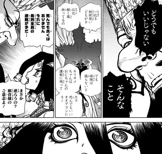 宰相イバラのペルセウスを奪って島全体を石化光線で包む作戦に気付いた千空は、ピンチこそチャンスじゃねえか、とペルセウスに集まった島民全員の前で石化した頭首を露わにしようとします。イバラの悪事を暴けば、頭首の子供のソユーズが正式な王位継承者となり、島の実権も石化装置も全てブン獲れる作戦です。