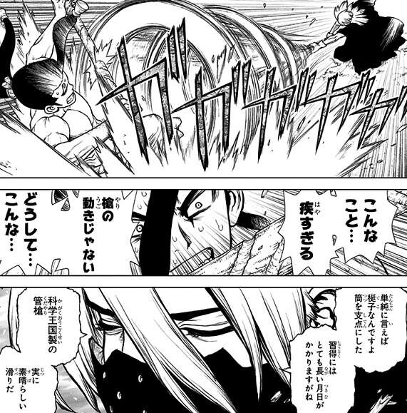 モズと戦闘中の氷月は、戦いに関して天才のモズに苦戦しますが、千空が作った即席潤滑油付きの竹筒を使用した管槍で反撃します。500年の歴史を受け継ぐ尾張貫流槍術と科学の槍を使う氷月には、モズも手も足も出ず氷月が圧勝します。