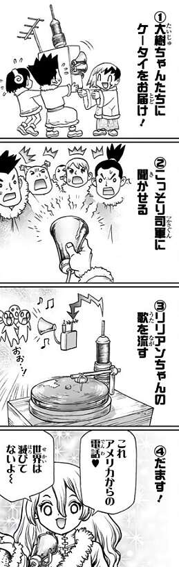 ゲンは、携帯電話を使って受話器からリリアン・ワインバーグの歌声を聞かせて、司帝国の人々を騙そうと考えます。リリアン・ワインバーグの歌声を聞かせた後、ゲンが声帯模写でリリアン・ワインバーグの声に似せて、アメリカ合衆国は既に復興していると嘘の希望を流して、司帝国をハメる作戦です。