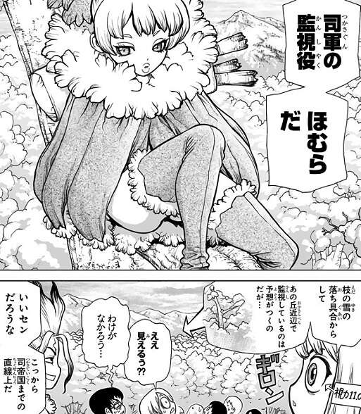 千空は司帝国の人々に、後で恨まれることを覚悟で作戦を実行に移す決意をします。ゲン、クロム、マグマの三人が携帯電話を大樹達にこっそり運搬する役目を担います。ただし、司帝国の監視役・ほむらが、石神村を監視している為、簡単に三人は出発出来ません。