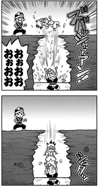 Z=55で雲母の穴に落ちた千空とマグマですが、本編ではマグマが千空を放り投げて、一足先に助けていますが、おまけマンガでは真上に投げてそのまま落ちて、失敗しています…。何度やっても、助かりそうにないですね…。