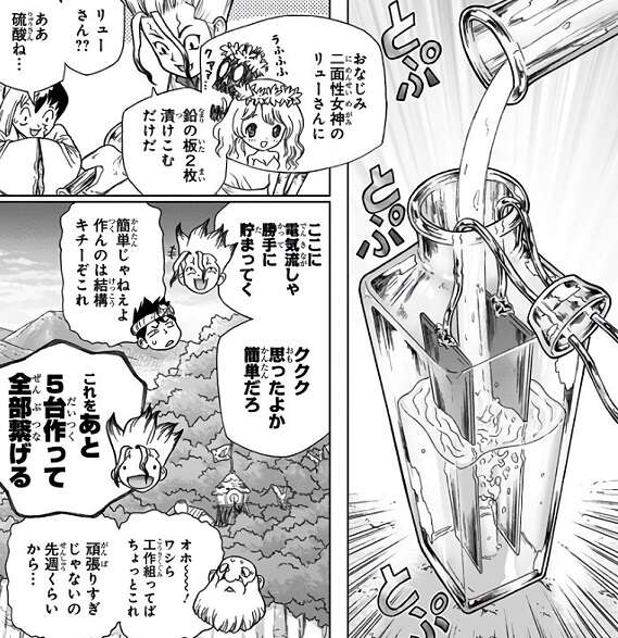 クロムとカセキが協力して作った水力発電所を利用し、千空はさらに電力を貯めるバッテリーも作成します。さらに水力発電所を利用し製鉄作業も自動化し、余ったマンパワーを冬備えの作業に集中させます。