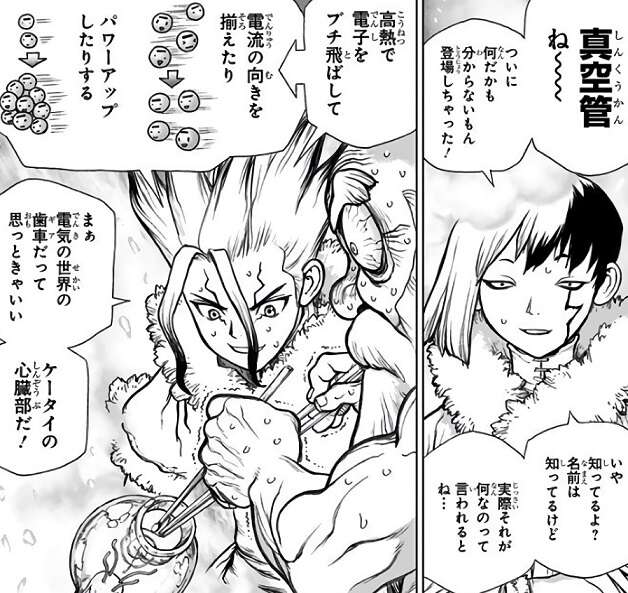 電球とバッテリーを携えたクロムは、洞窟の奥深くまで探索に向かいます。一方、千空は電子のギア・真空管の作成に取り掛かりますが、真空管のフィラメントの作成に行き詰ります。真空管のフィラメントに必要な材料は、この時代に無いと千空は言い、千空が別の手を考えているといつの間にか新年を迎えてしまいます。