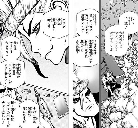 クロムが集めた石の中に偶然、灰重石(かいじゅうせき)=タングステンがあり、朝陽が昇る直前の一瞬に、スイカが石を太陽にかざしたことで太陽の紫外線と反応し、タングステンだと判明します。洞窟の奥深くにタングステンがあると分かり、千空、クロム、マグマの三人で探検隊トリオを結成します。しかしマグマは千空達に協力する気はなく、隙あらば千空達を殺して村長の座を乗っ取ろうと考えます。