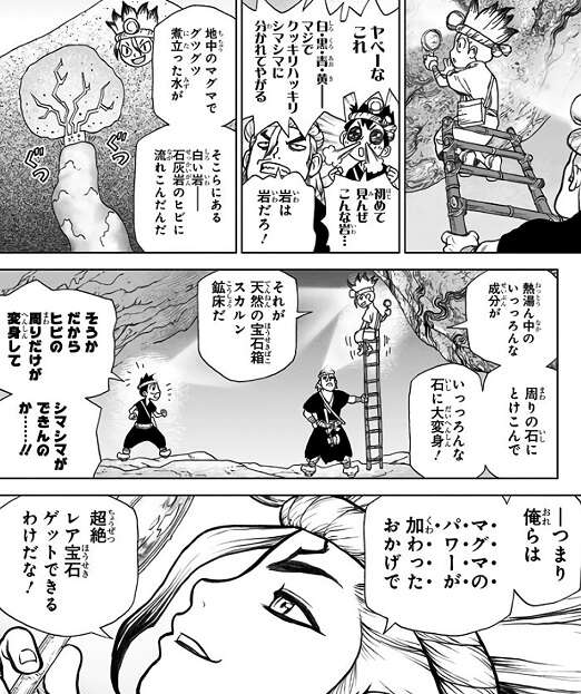 千空と協力して雲母の穴から脱出する過程で、マグマは彼なりに改心し千空達のタングステンの採掘に協力します。そして洞窟の奥には天然の宝石箱、スカルン鉱床がありタングステンだけでなく、マンガン、黄銅鉱、閃亜鉛鉱など貴重な金属の採取に成功します。