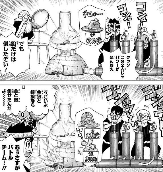 千空は採掘したタングステンを加工し、タングステンフィラメントを作ろうとしますが、タングステンは最低1000℃以上で加熱する必要があり、クロムとカセキは加熱装置を作成するのに苦労します。まずクロムはレンズを使って、太陽光を集めて熱しようとしますが、全く温度は上がりません。そこでクロムは火も追加で使い、温度をどんどん上げていきます。