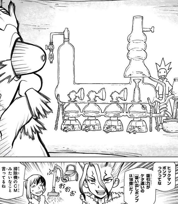 タングステンフィラメントも完成し、いよいよ携帯電話・本体の作成に取り掛かります。ケータイの心臓部・真空管、ケータイの骨格・プラスチック、ケータイの血管・金の電線の3つのボディパーツが必要で、カセキは真空管の作成にやる気を出します。しかし、真空管作りの仕上げに必要なヒックマンポンプの設計図を見て、カセキは意欲を削がれてしまいます。