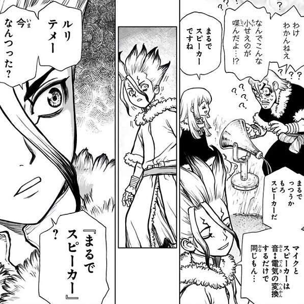 携帯電話を完成させ、千空達はテストも兼ねてスピーカーを使って携帯電話の音声が通じるかテストを行います。そのテストの最中に、ルリが発した、まるでスピーカーみたい、という言葉から、石神村に伝わる百物語・其之14に現代人にだけ何か伝えようとしているメッセージがあることに気付きます。