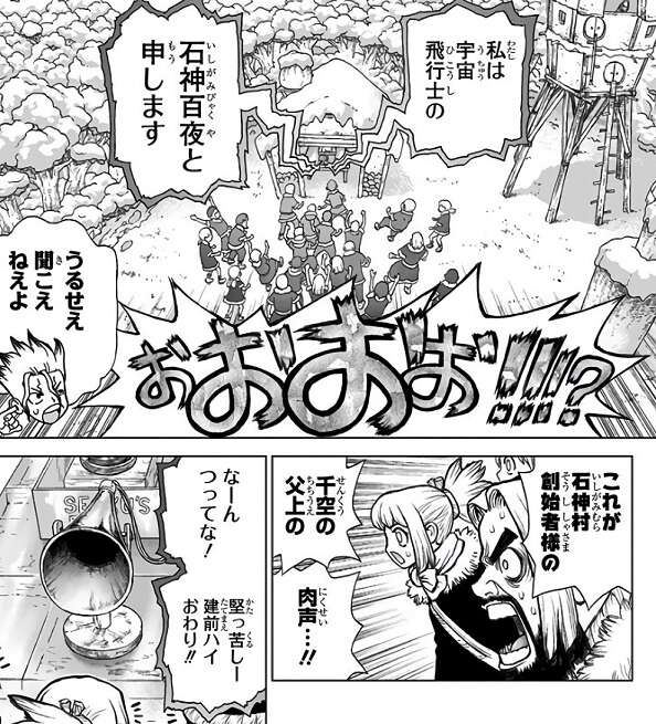 墓石から見つけたガラスの円盤の正体はレコードで、百夜の肉声メッセージやリリアン・ワインバーグの歌声が封じられていました。リリアン・ワインバーグの歌声を聞いた石神村の住民は、旧人類達が育んだエンターテイメントに興味を持ち、士気が一気に上がります。一方、リリアン・ワインバーグの歌声を聞いたゲンは、ある作戦を思いつきます。