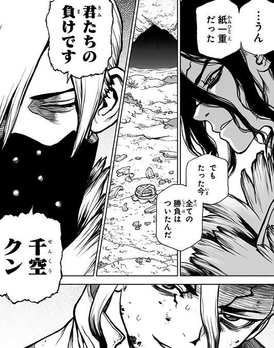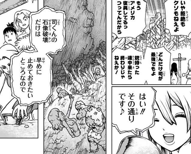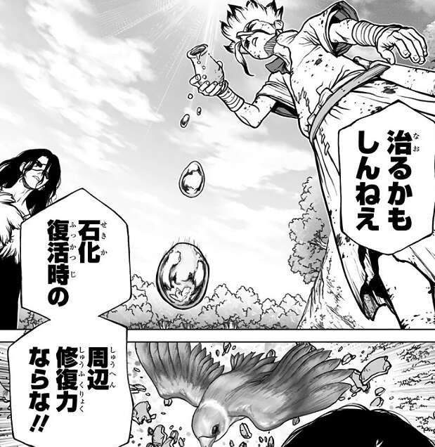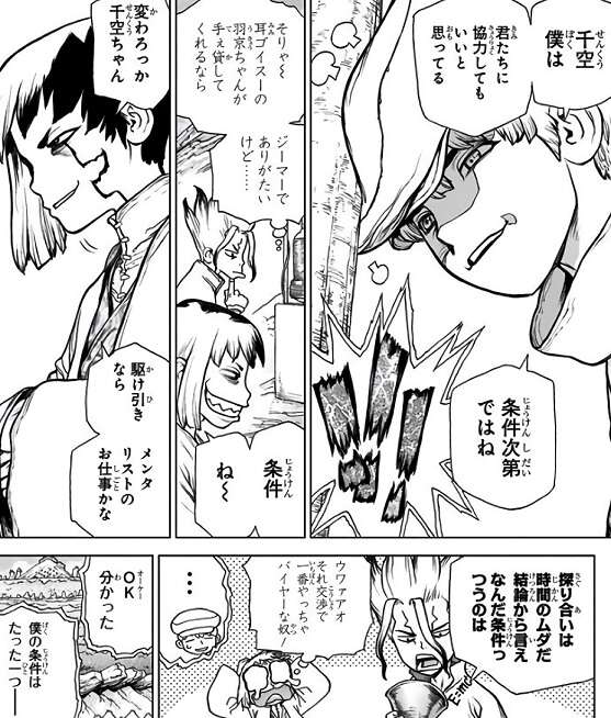 千空はニトログリセリンを染み込ませた紙飛行機で紙飛行機ダイナマイトを作り出し、司と氷月にダイナマイトの破壊力を見せつけます。司達が動けない状況を作り出してから、千空は司に取引を持ち掛けます。司が文明崩壊前にテレビや試合に出まくって、金を稼いでいたのは、臨床的脳死となった妹の為だったと千空は指摘し、石化復活時の周辺修復力で妹の病は治る可能性がある、と千空は司に言います。