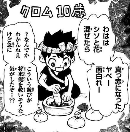 Z=72でシソを使って見事、クロムは脱出に成功しますが、シソと花を混ぜたら、真っ赤になるということは10歳の時に、既に発見していました。10歳の頃から、クロムはこういう遊びを通して素材集めをしていたのですね。