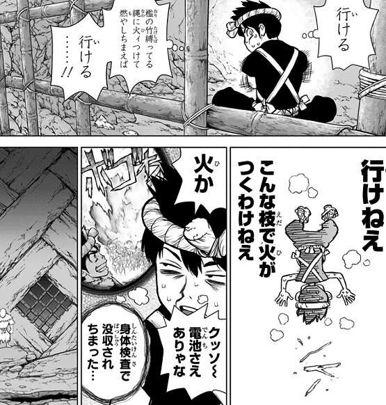 司帝国に捕まってしまったクロムは、科学パワーを使って自力で脱獄しようとし、何か化学アイテムはないか探し始めます。しかし枯れ枝や草、枯れたシソなどロクなものが集まらず、クロムは脱獄出来ないまま夜を迎えます。夜になってクロムが寝ていると、何故か枕元に電池があり、クロムは電池を使って檻の縄を燃やそうとします。