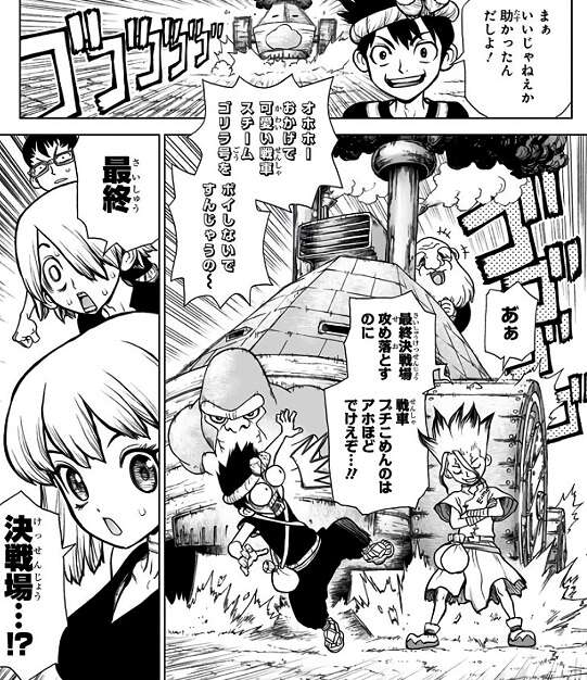 自力で脱出したクロムは、無事千空達と合流します。クロムが自力で脱出したおかげで、戦車に強化したスチームゴリラ号を使い捨てせずにすみ、千空は最終決戦場にスチームゴリラ号を投入すべく準備をします。