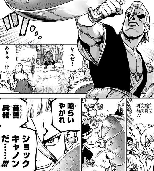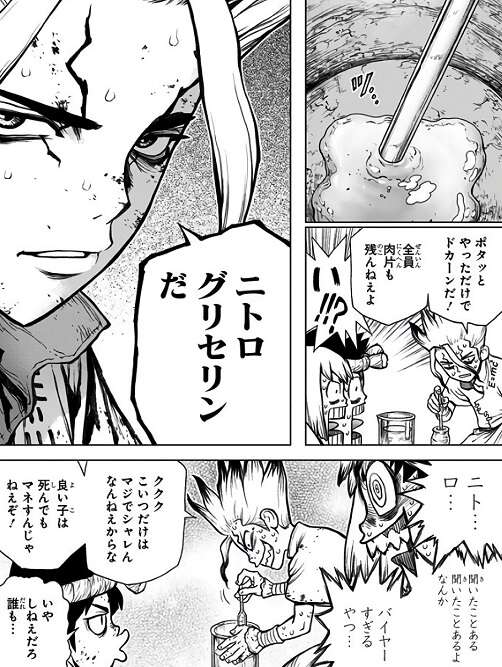 化学王国のバトルチームが司と氷月を食い止めている間に、千空達は硝酸から科学の武器を作ろうとします。しかし、都合よく科学の武器は出来ず千空が次の手を悩んでいると、クロムが潰れた戦車から硫酸を持ってきます。千空は硝酸、硫酸、そして石鹸からニトログリセリンを作り出します。