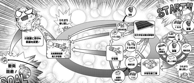 人類最後の6人(+ロボット1台)は、石化光線の発生源と思われる南米から最も遠い場所にある、日本付近に宇宙船ソユーズで帰還することにします。しかし、狙った着地点に降りるのは至難の業で、皆不安になりますが百夜は出来るまで∞にシミュレーションするしかない、と断言し皆を奮い立たせます。