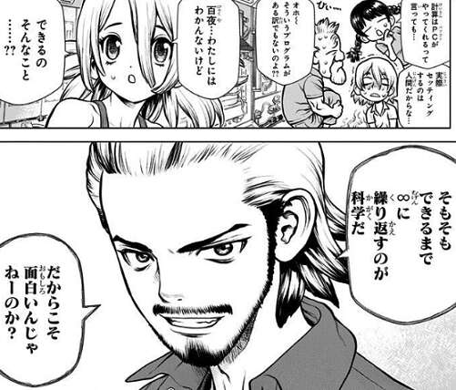 千空がまだ10歳の頃、父親の百夜は非常勤の大学に千空を連れて行きます。自分が宇宙飛行士に選ばれたお礼として、自分が作ったとっておきのロボットを見せます。最初に見せた人間の女性そっくりのロボットに千空は感動しますが、実際はタダの模型で百夜のこんなロボットだったらいいなという願望でした。本当のロボットは見た目がいかにもなロボでしたが、それでも千空は、唆るじゃねえか!!と興奮します。