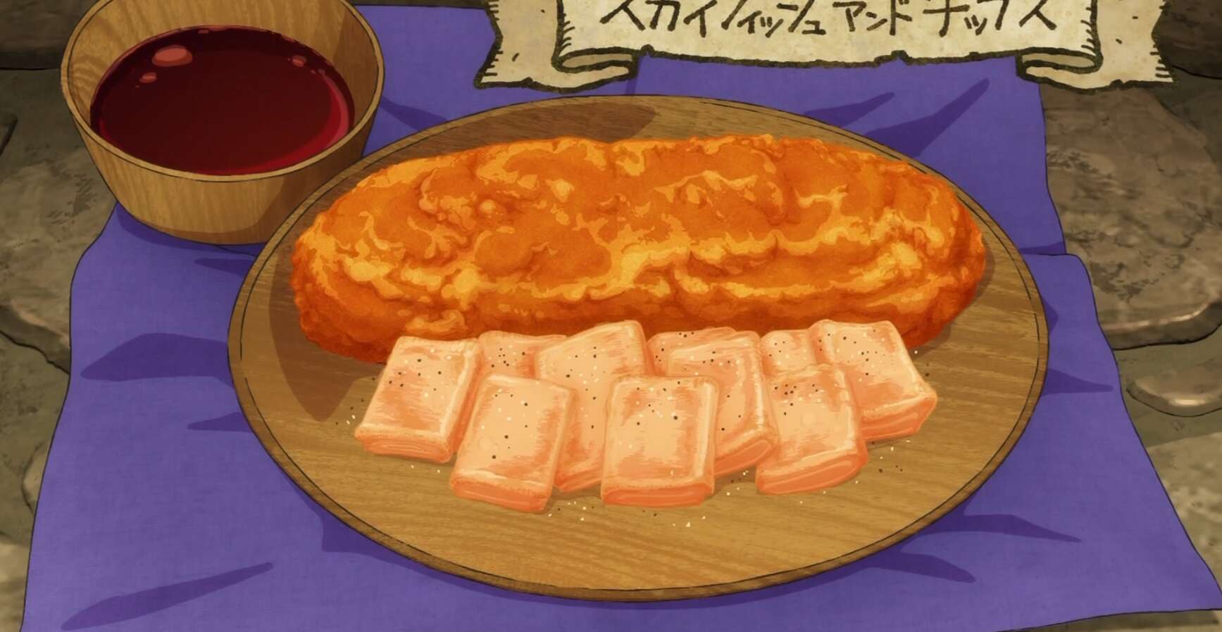 ライオスに諭されてどうでもよくなったマルシルはスカイフィッシュを好きにするように言い、ライオスはスカイフィッシュを調理して、スカイフィッシュ アンド チップスを完成させます。