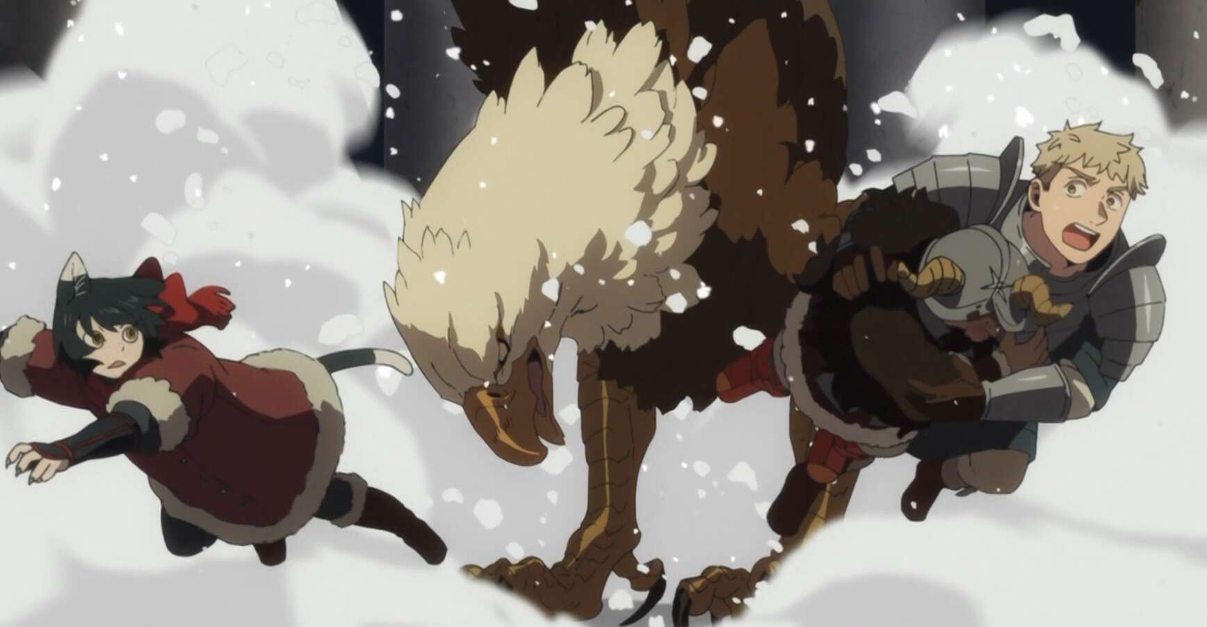 一方、挙動不審のセンシはグリフィンを見るといきなり逃げ出してしまい、不用意に背中を見せて逃げ出したセンシをグリフィンは襲います。マルシルが魔法でグリフィンを攻撃しようとしますが狙いが定まらず、そうこうしている内にセンシはグリフィンに連れ去られてしまいます。ライオス達はセンシを掴んで逃げていくグリフィンを必死で追いかけますが、一瞬の事で何も出来ず、そのままグリフィンを見失ってしまいます。このままではセンシの死体がどこにあるかもわからず、蘇生も出来ず、二度とセンシに会えなくなってしまうとライオスは焦ります。