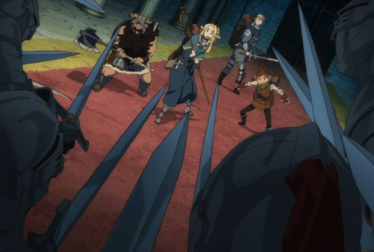 気を取り直して迷宮の先へと進もうとしますが、部屋には多数の動く鎧が静止したまま立っていました。ライオス達は走り抜けて一気に部屋を突破しようとしますが、動く鎧は一斉に行く手を塞ぐように襲い掛かってきて、仕方なく引き返して態勢を整える事にします。