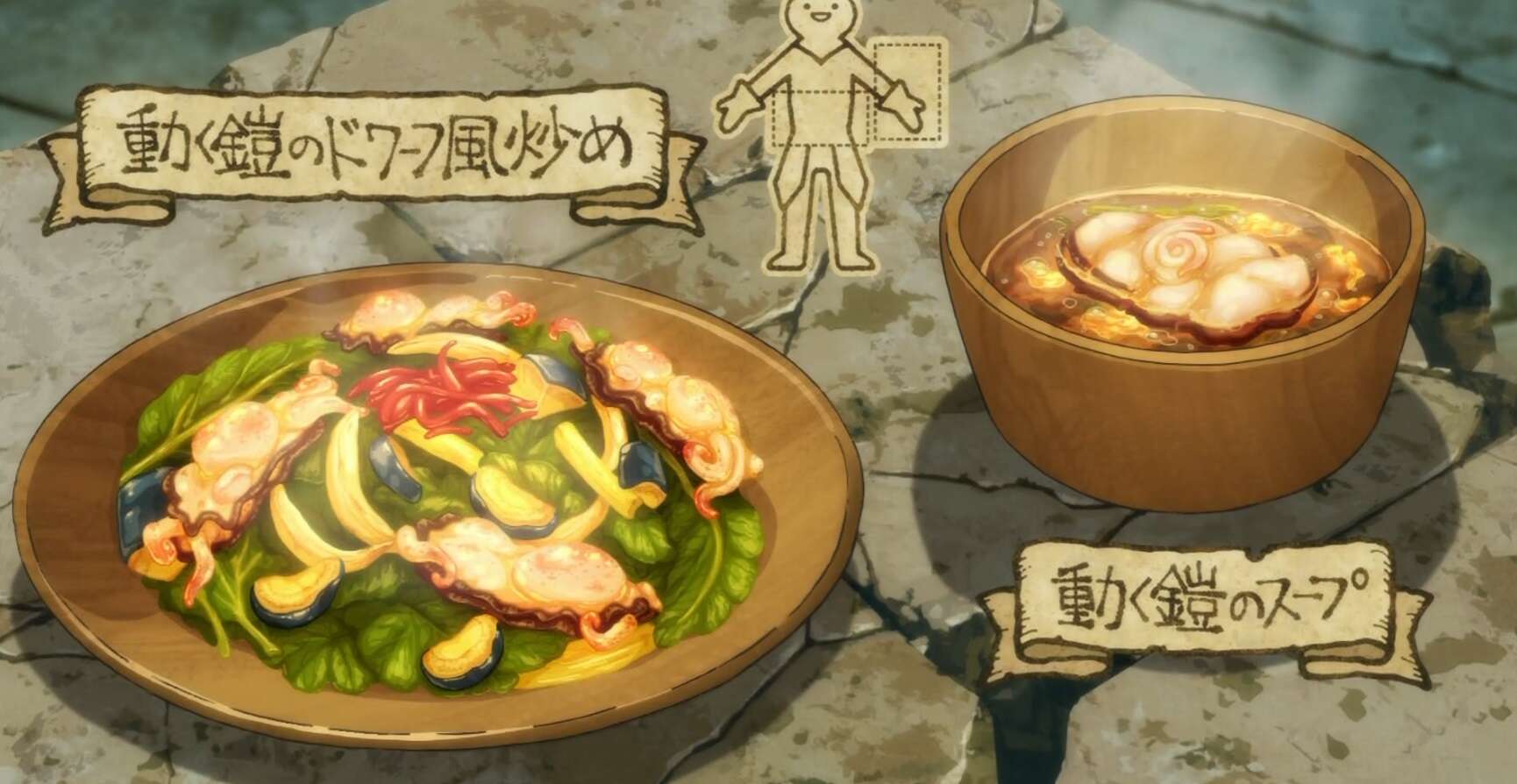 センシは軟体動物を使って様々な方法で料理し、動く鎧のフルコースを作ります。動く鎧のドワーフ風炒め、動く鎧のスープ、、焼き動く鎧、動く鎧の蒸し焼きを作りますが、マルシルやチルチャック、センシは毒がないか警戒し、食べようとしません。3人はまずはライオスに毒見をさせて、動く鎧で食中毒に当たらないかを試すことにし、死んだらライオスを捨てていこうと密かに企みます。