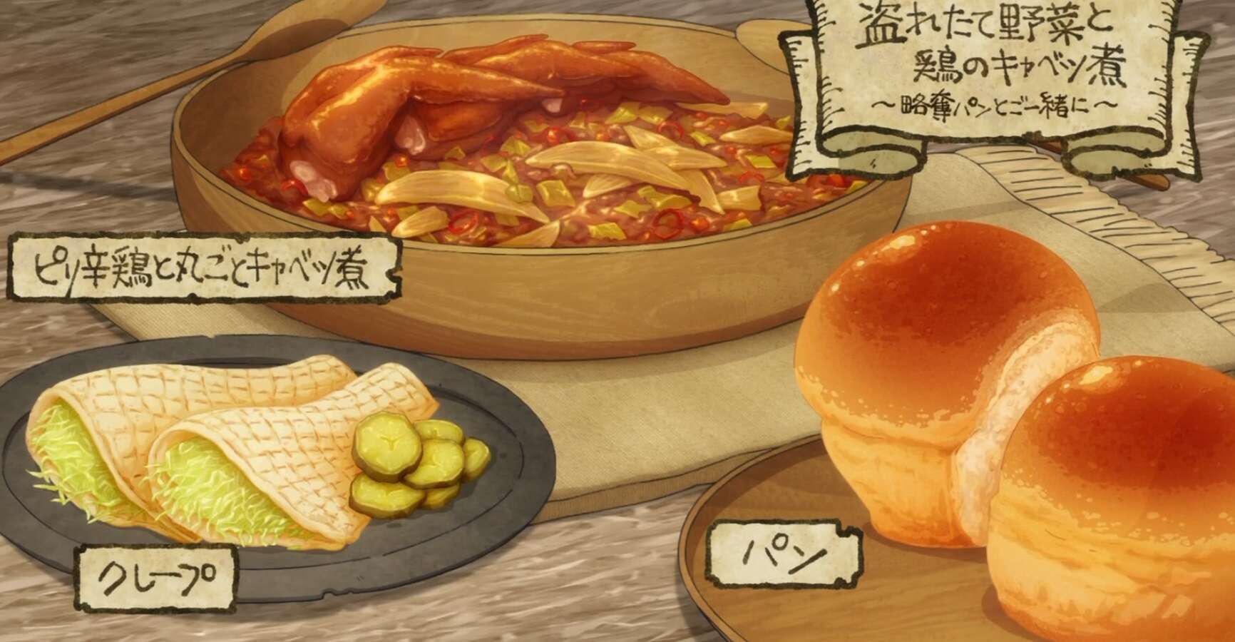 第4話では、ゴーレムの背中から収穫した野菜を元に作った、ゴーレム畑の新鮮野菜ランチを食べています。また、オークに捕まった際にオークの族長・ゾンから振舞ってもらった、ピリ辛鶏と丸ごとキャベツ煮やクレープを食べてます。今回はダンジョンの中では珍しく魔物が食材として使われていないので、マルシルも嫌がることなくおいしそうに頂いています。