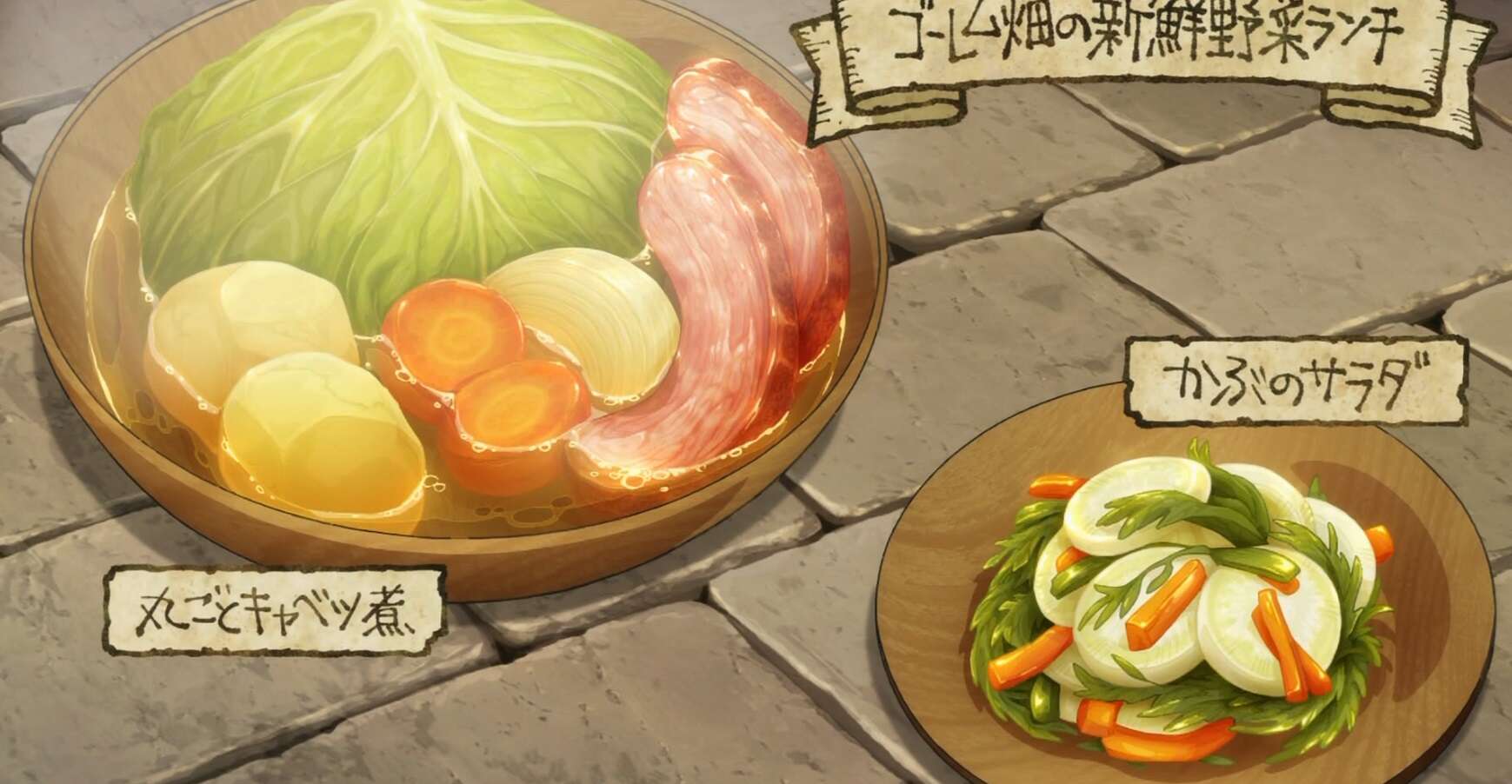 収穫した野菜で、丸ごとキャベツ煮とかぶのサラダを作り、ゴーレム畑の新鮮野菜ランチを皆で食べます。