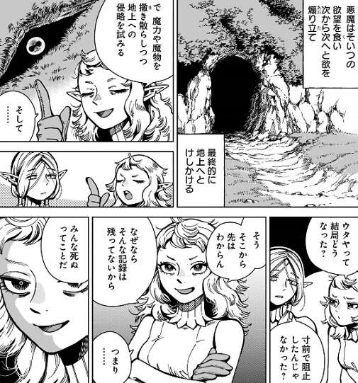 そして悪魔は迷宮の主の欲望を食い、次から次へと欲を煽り立て地上へとけしかけ、魔力や魔物を撒き散らしつつ地上への侵略を試みます。ウタヤの最後は記録に残っていないようで不明ですが、最終的にはみんな死んでしまいそうです。