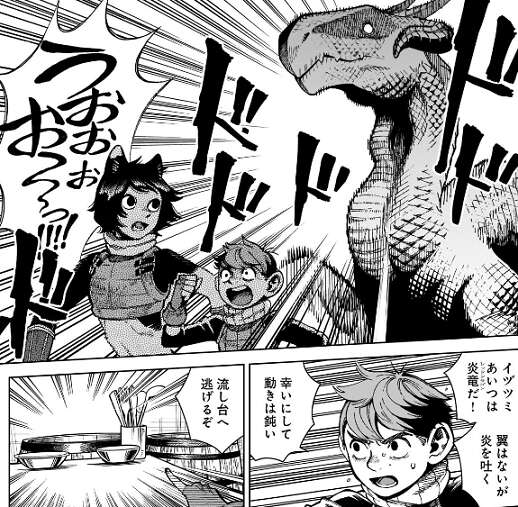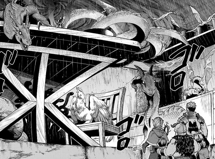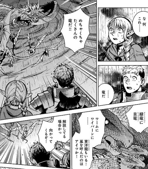 モンスター博士のライオスが、グリーンドラゴン、レッドドラゴン、ワームに、ワイバーンに、東洋龍もいる!とわざわざ解説してくれます。チルチャックが、解説してる場合か、とライオスに突っ込み、襲ってくるたくさんのドラゴンから逃げ出します。